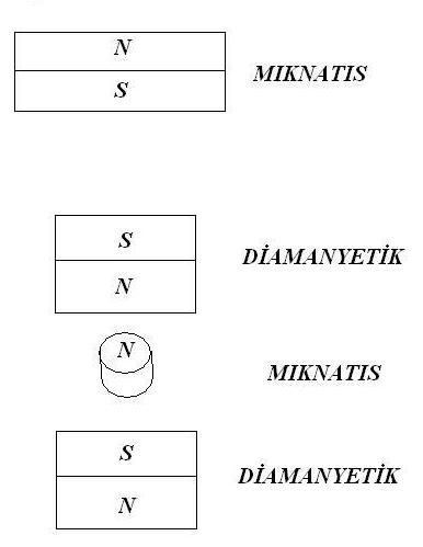 Küçük mıknatıs hem üstteki güçlü mıknatıs hem de diamanyetik plakalar tarafından itilir.
